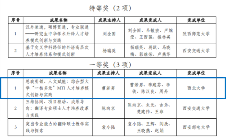 Recently, the Shaanxi Association for Academic Degrees and Graduate Education announced the results of the 2023 Shaanxi Provincial Foreign Language Teaching Achievement Awards. Our university submitted 2 teaching achievements, both of which received awards. Among them, the project “With the Guidance of Ideology and Politics and Empowerment of the Humanities: Innovation and Practice of Comprehensive University’s ‘One Core, Multiple Elements’ of MTI Talent Training Model” submitted by our school won the first prize.