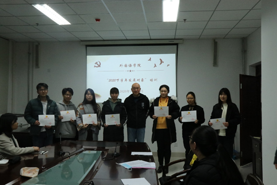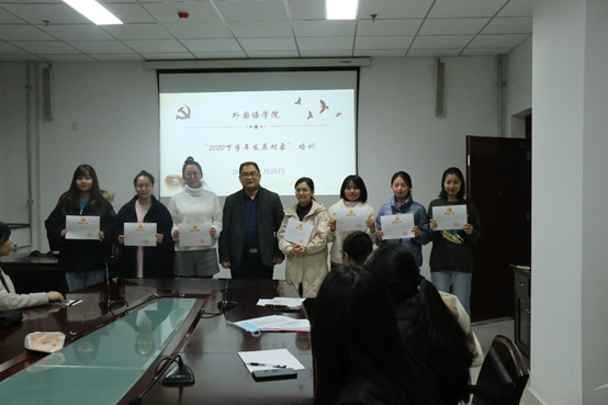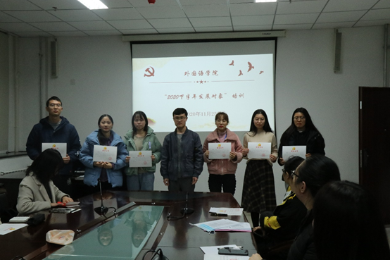 为贯彻落实《中国共产党章程》、《中国共产党发展党员工作细则》,严格发展党员工作程序,推进党员发展规范化,贯彻落实“控制总量、优化结构、提高质量、发挥作用”的发展党员要求,把好党员“入口关”, 按照中国共产党发展党员工作流程和学校及学院党员发展规定,11月18日至11月25日,外国语学院党委组织了2020年下半年发展对象集中培训,来自学院各党支部共27人参加。