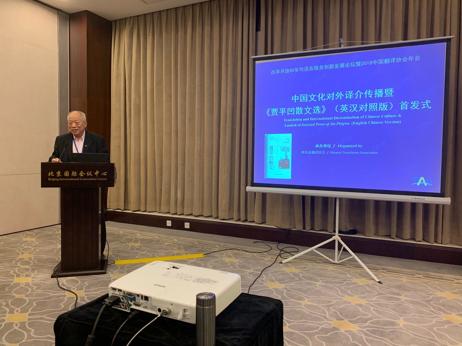 应中国翻译协会邀请,陕西省翻译协会在“改革开放40年与语言服务创新发展论坛暨2018中国翻译协会年会”上承办中国文化对外译介传播主题论坛暨《贾平凹散文集》(汉英对照版)首发式。