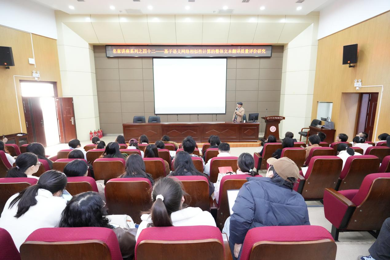 2024年11月29日下午,西安外国语大学二级教授、博士生导师、“西外学者”领军学者、中国语言教育研究会常务理事、世界翻译教育联盟语料库研究会副会长、西部地区外语教育研究会常务理事汪顺玉教授做客必赢亚州242“名家讲座”第42期,为师生作了题为“基于语义网络相似性计算的整体文本翻译质量评价研究”的讲座。讲座由外国语学院副院长苏蕊主持。校内约一百位师生聆听了讲座。