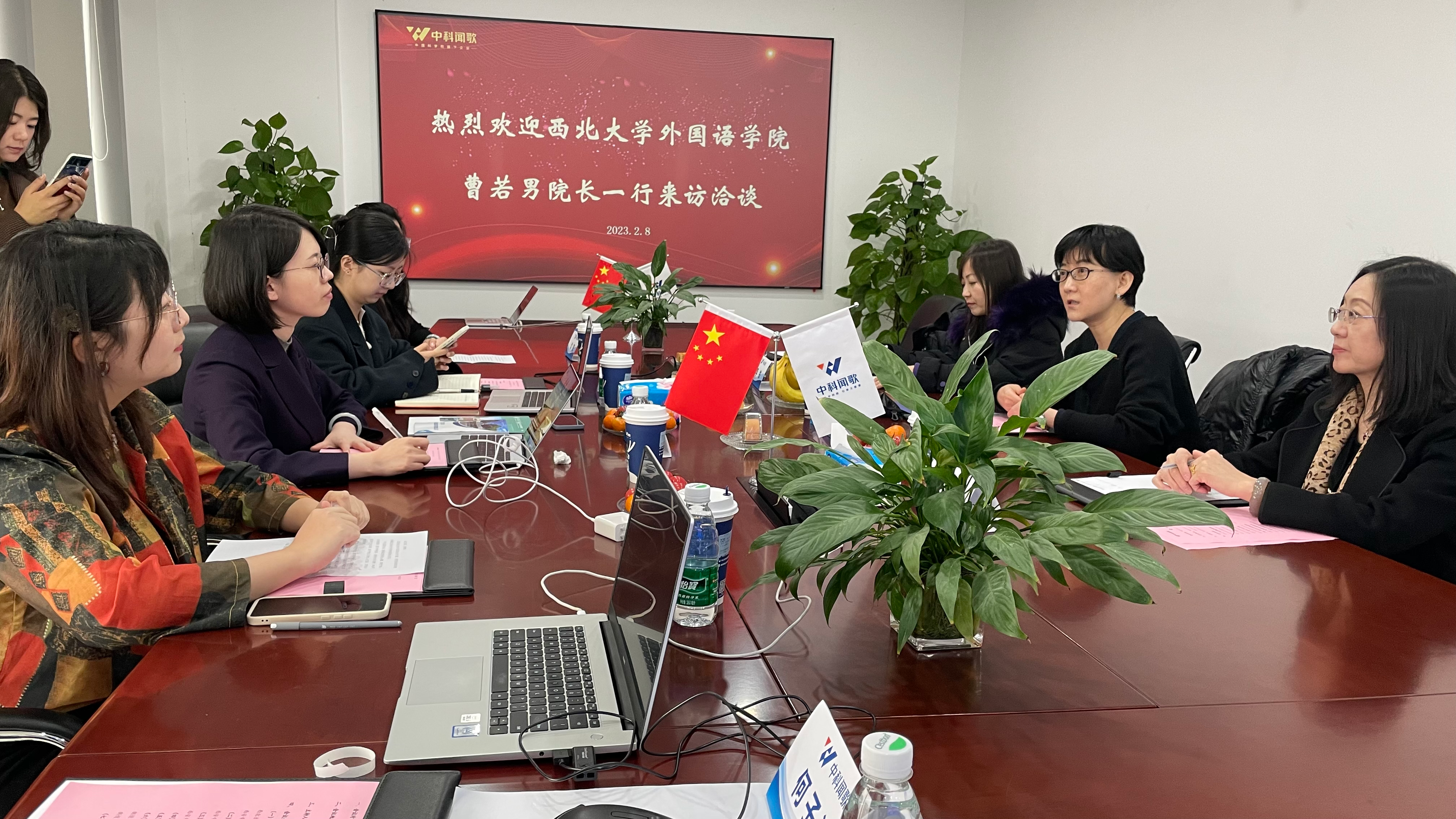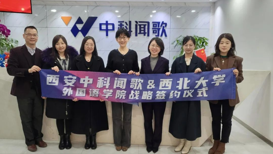近日,我院院长曹若男与MTI教育中心负责人一行参观访问西安中科闻歌科技有限公司,签订院企合作协议,共建“西北大学研究生示范性实践基地”。
